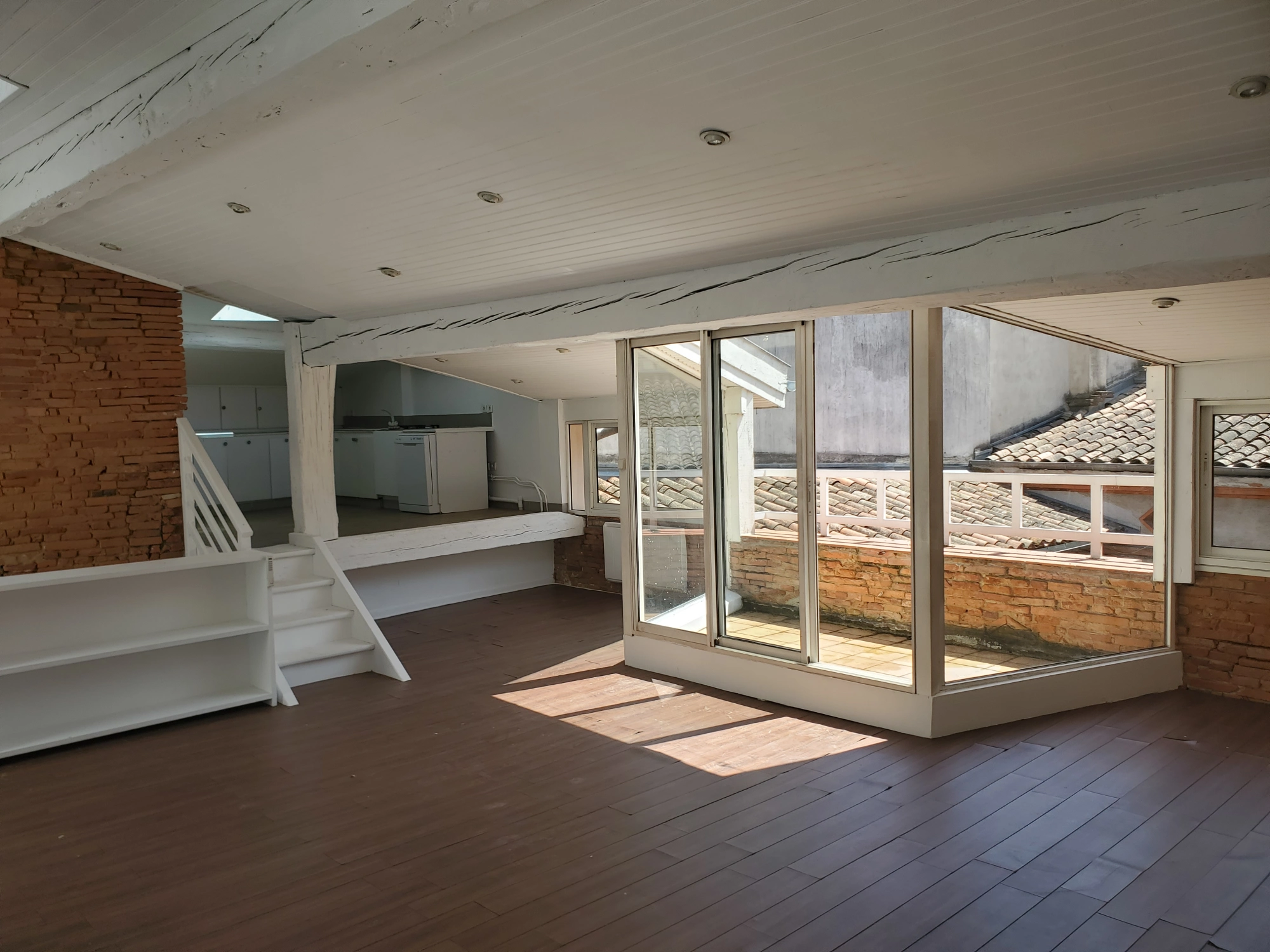Cet appartement en duplex se trouve au sommet d’un immeuble ancien dans le centre médiéval de Toulouse. Le projet consiste en une réhabilitation globale d’un logement tout en demi-niveaux, dont la remise à plat a permis le rafraichissement des espaces et l’amélioration de son fonctionnement. Dans le séjour, des fenêtres de toit présentes dans la double hauteur animent un vieux mur de briques au fil de la course du soleil. Les éléments patrimoniaux ont été conservés et valorisés (tomettes, charpente, menuiseries, cheminées anciennes).