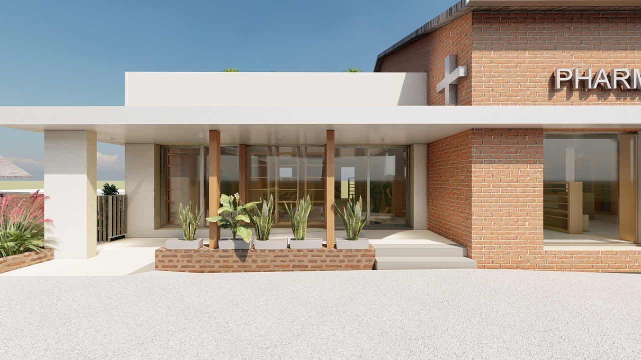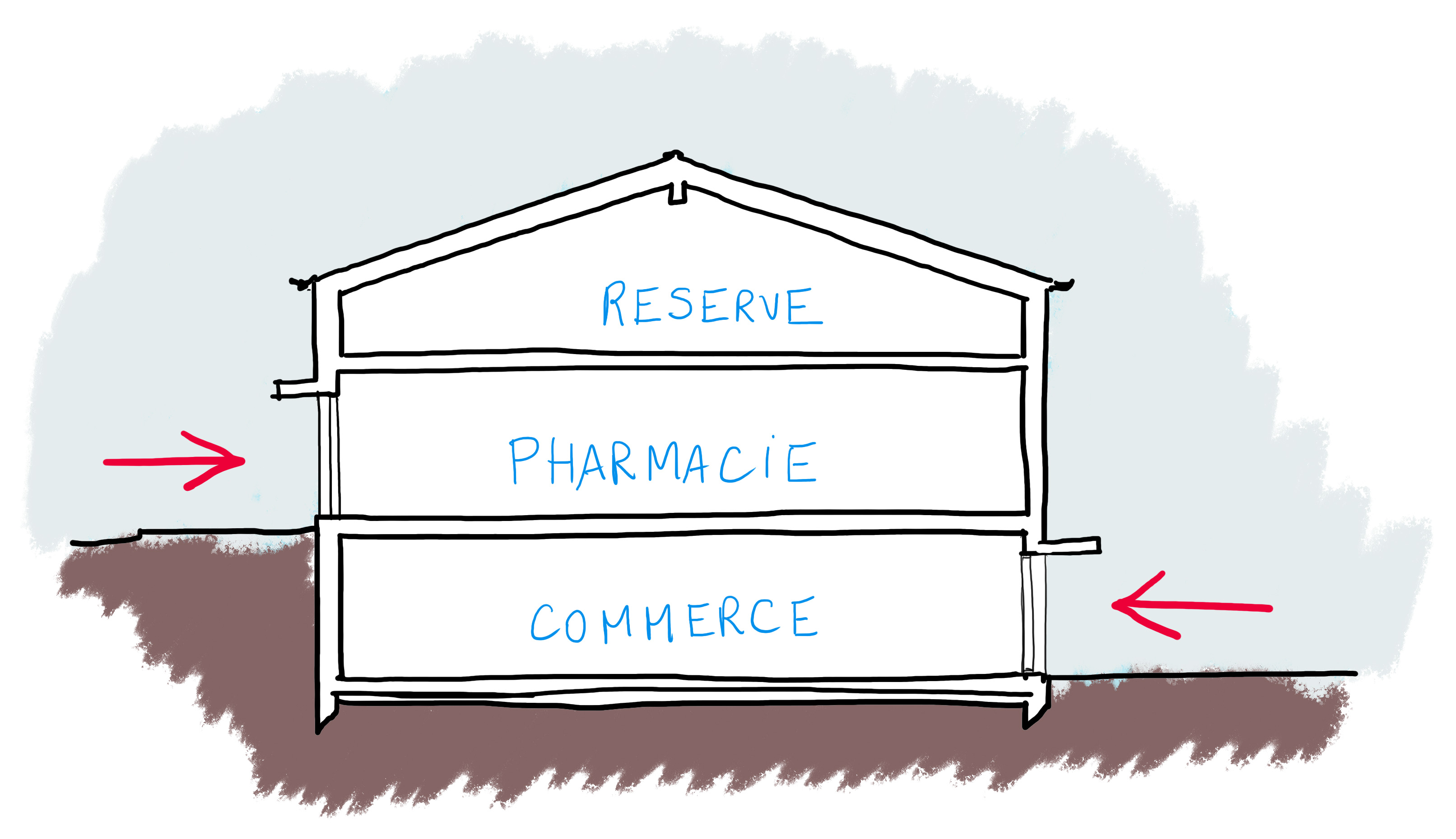 Au cœur du village, le projet remplace un ancien hangar déconstruit pour l'occasion. Il accueille la toute nouvelle pharmacie et un commerce alimentaire. Le volume bâti joue avec la pente pour offrir 2 entrées distinctes à ces 2 ERP superposés. L'emploi de matériaux locaux et l'aménagement d'un toit terrasse végétalisé permet d'assurer une bonne intégration paysagère.