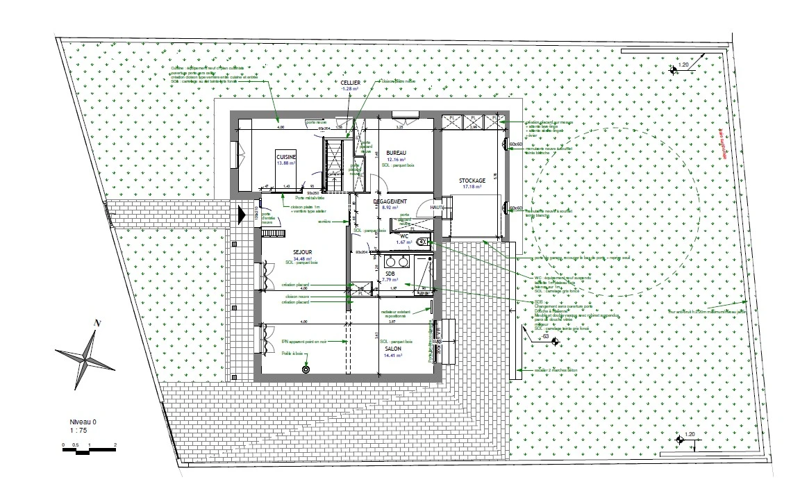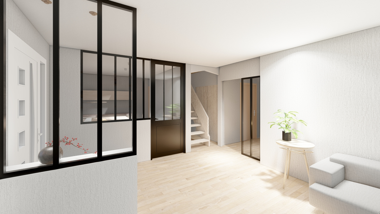 Le projet porte sur une maison individuelle présentant de belles surfaces, dont la perception est entachée par une circulation peu optimisée et un cloisonnement omniprésent. La réhabilitation de cette maison commence dès l’entrée via la mise en place d’une verrière intérieure côté cuisine, et l’ouverture franche sur le séjour de l’autre côté. Les ouvertures sur l’extérieur ont également été repensées pour répondre à une amélioration de la luminosité naturelle.